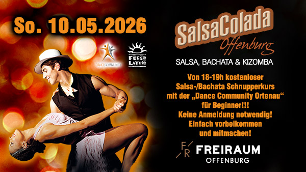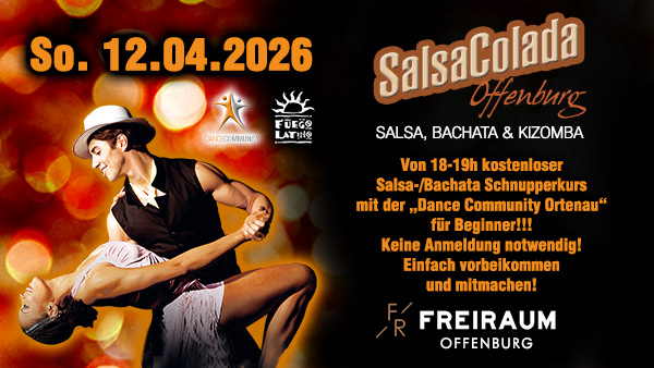An diesem Sonntag bieten wir Euch im FREIRAUM OFFENBURG ab 18:00 Uhr einen kostenlosen Salsa-Bachata Schnupperkurs mit der "Dance Community Ortenau" für Beginner an.