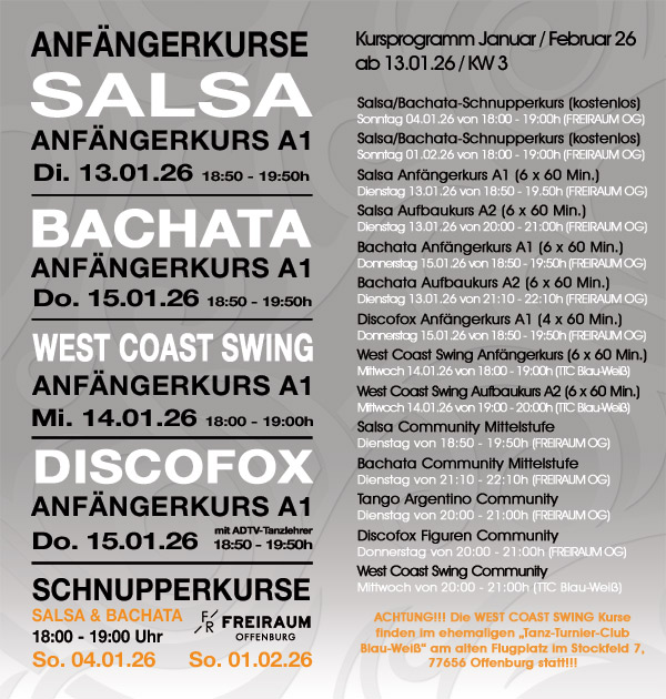 und Tango) sowie alle Trend- und Modetänze wie Salsa, Bachata, Kizomba,